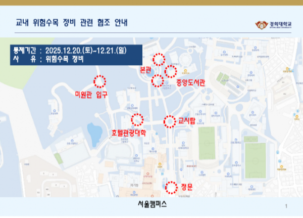 1. 교내 위험수목 정비에 따라 부분 통행제한이 이루어질 예정이니 협조하여 주시기 바랍니다.