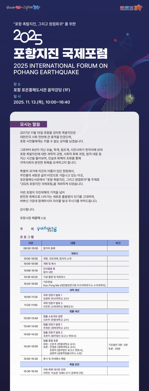 포항지진 8년을 맞아 “포항 촉발지진, 그리고 원점회귀” 라는 주제로 학계, 법조계, 시민사회가 한자리에 모여 지진에 대한 과학적 분석, 사회적 회복 과정 등 진실과 화해의 조화를 통해 지역사회의 완전한 회복을 모색하고자 합니다. 특히 지진의 아픔이 있었던 현장에서「2025 포항지진 국제포럼」을 아래와 개최하오니 많은 관심과 참여를 부탁드립니다.
