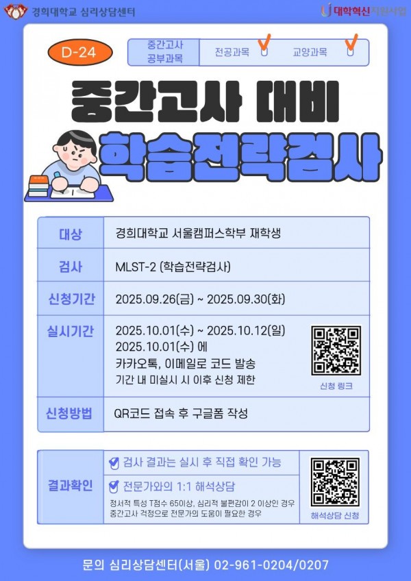 1. 심리상담센터는 2학기 중간고사를 앞두고 본교 소속 학부 재학생들이 학습전략 및 습관을 점검하여 중간고사를 잘 준비할 수 있도록 돕고자 심리검사를 실시합니다.
