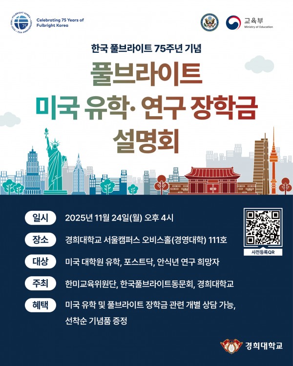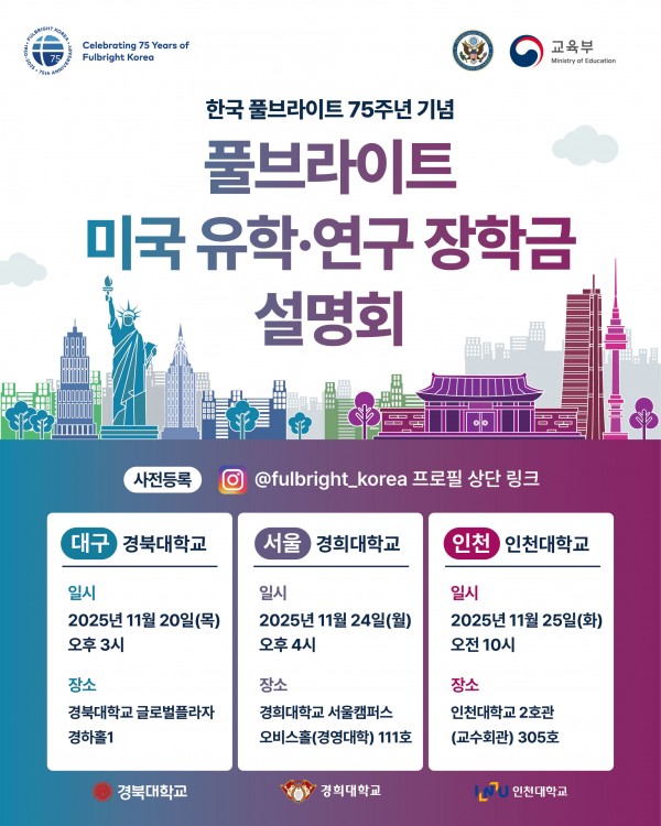 한미교육위원단은 한국 풀브라이트 75주년을 기념하여 풀브라이트 미국 유학·연구 장학 금 설명회를 진행하고자 합니다.