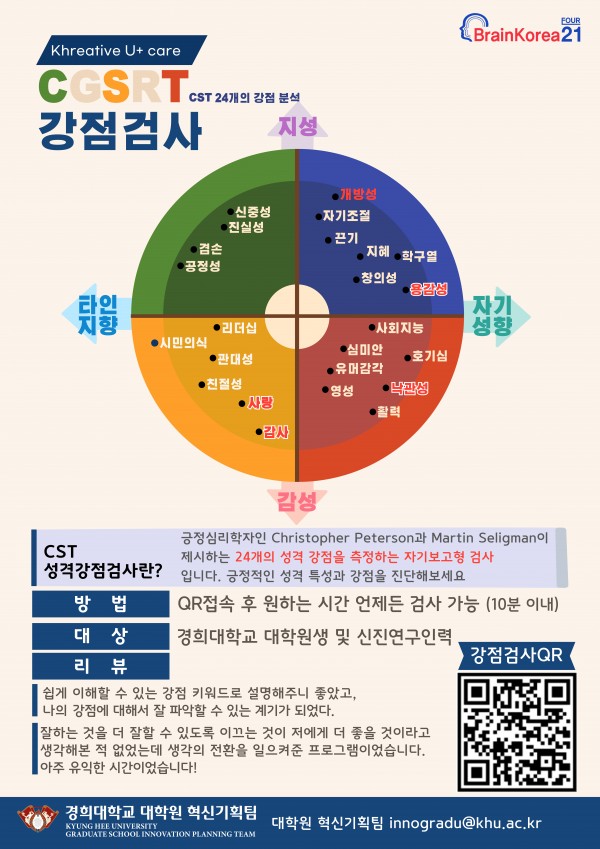 [대학원혁신기획] 일반대학원 신입생/ 재학생을 위한 CST강점검사 홍보 안내 페이지 정보 작성자 종합행정실 댓글 0건 조회 29회 작성일 26-04-24 09:06 본문 대학원혁신기획팀에서 본교 대학원생/ 대학원 신입생/ 신진연구인력 및 각 교육연구단에게 CST 강점검사를 지원하고 있습니다. 자세한 사항은 포스터를 참고해 주시기 바랍니다. 목록 이전글평화의전당 광장 주차통제 안내[2026 이소라 여덟번째 봄 콘서트 '봄의 미로'] 26.04.24 다음글지구의날 56주년 전국 소등행사 안내 26.04.21 댓글목록 댓글목록 등록된 댓글이 없습니다.