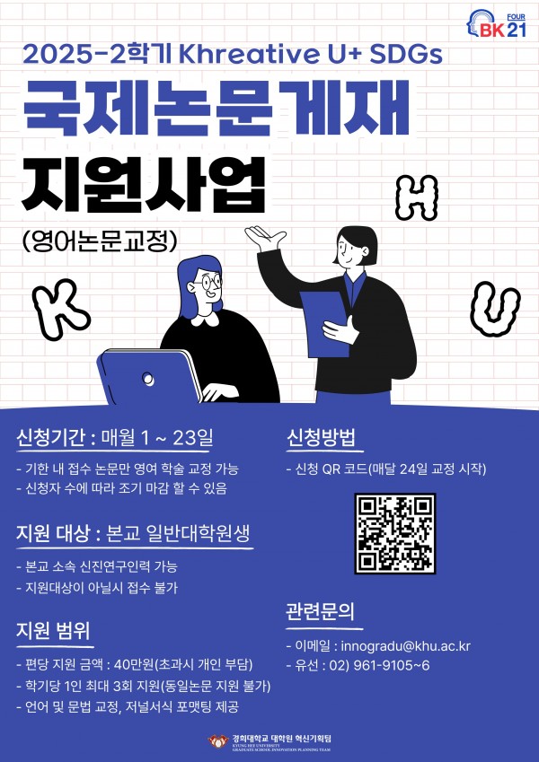 [대학원 혁신기획팀] 11월 국제논문게재(영어논문교정) 지원사업 안내 페이지 정보 작성자 종합행정실 댓글 0건 조회 12회 작성일 25-11-04 09:33 본문 접수 링크 : https://forms.gle/z33R6cuVijGFCBiy7학습 플랫폼 링크 : https://www.enago.co.kr/kyunghee-grad-uni/videos/ 목록 이전글2025학년도 2학기 일반대학원 학술지 논문게재 및 학술대회 논문발표장학 신청 안내 25.11.11 다음글일반대학원 2025학년도 전기(2026년 2월) 졸업예정자 대상 우수학술상 선발 및 신청 안내 25.10.31 댓글목록 댓글목록 등록된 댓글이 없습니다.