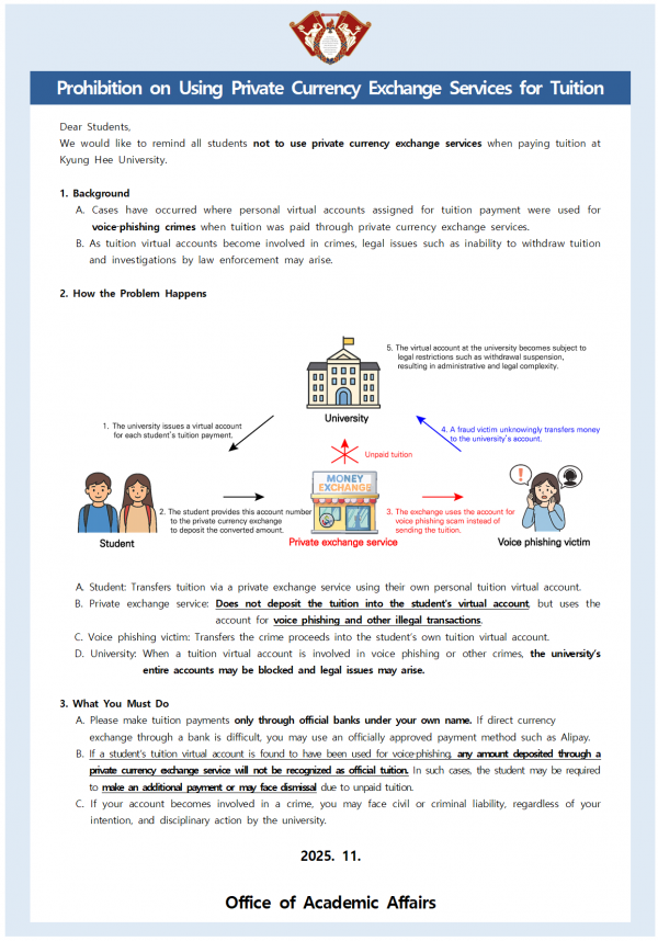 (외국인학생 대상) 등록금 및 기숙사비 납부 시 사설환전소 이용 금지 안내 페이지 정보 작성자 종합행정실 댓글 0건 조회 10회 작성일 25-11-17 09:24 본문 2025. 11. 17.법학계열 종합행정실 목록 다음글2025학년도 2학기 대학원 법학과 학위청구논문 심사 결과 제출 안내 25.11.13 댓글목록 댓글목록 등록된 댓글이 없습니다.
