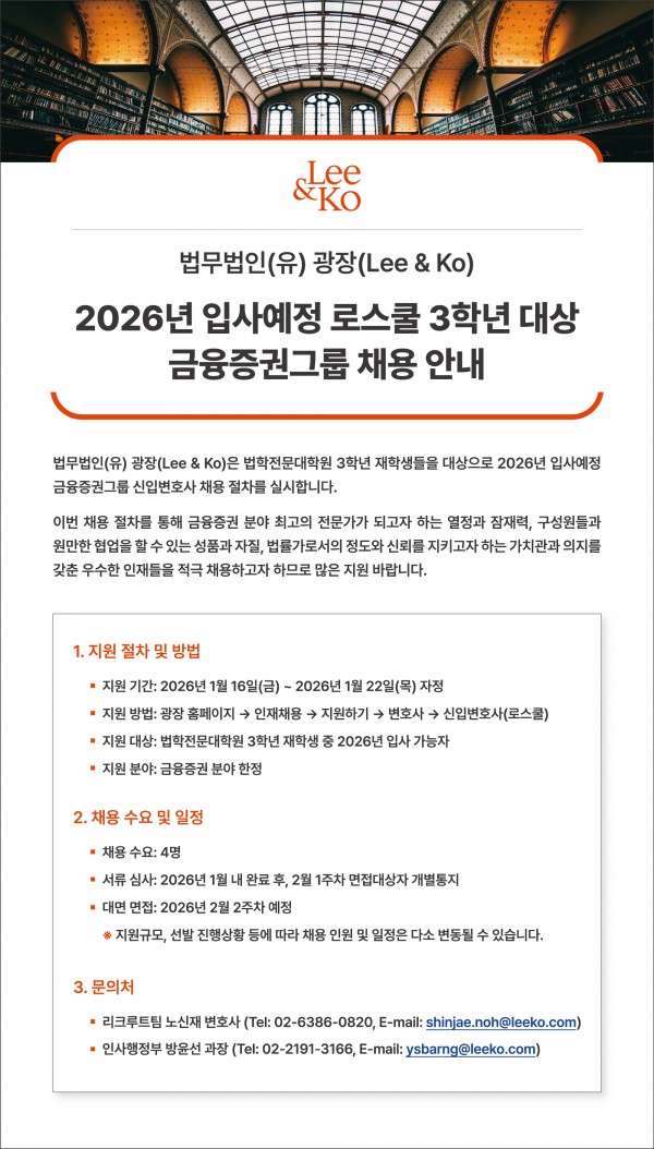 [법무법인(유) 광장(Lee & Ko)] 2026년 입사예정 로스쿨 3학년 대상 금융증권그룹 신입변호사 채용 안내